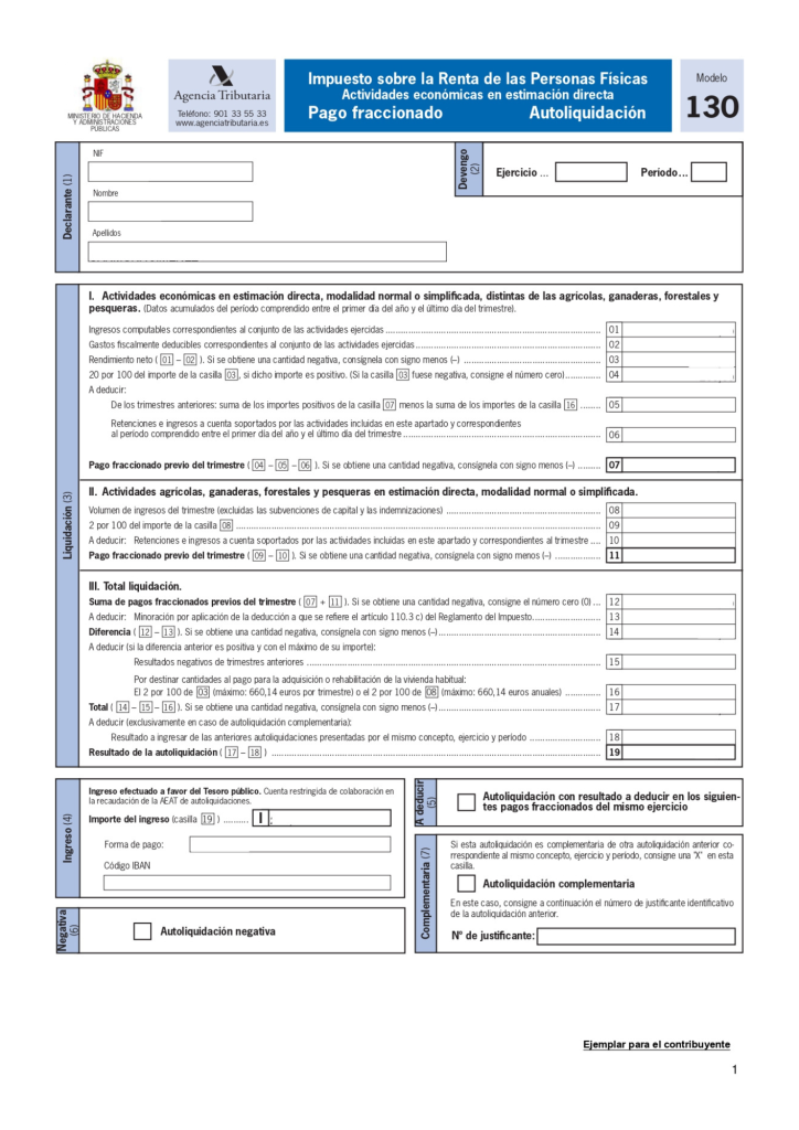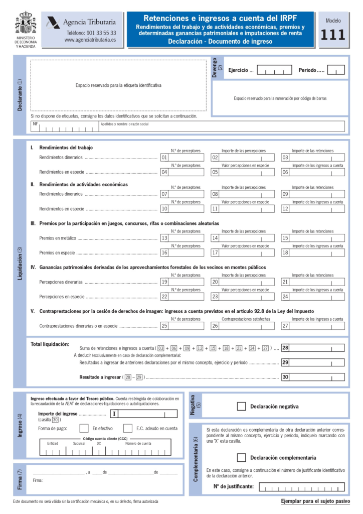 Este modelo no es como los anteriores, es decir, no se presenta siempre. Aquí reflejamos las cantidades, que por sus razones hemos retenido, en vez de pagarlas al destinatario. Por ejemplo, si contratamos a los empleados. Antes de abonarles sus sueldos, entre otros importes, tenemos que retener un porcentaje y pagarlo a Hacienda en concepto de pago anticipado en cuenta de Impuesto de la Renta las Personas Físicas del empleado en cuestión.