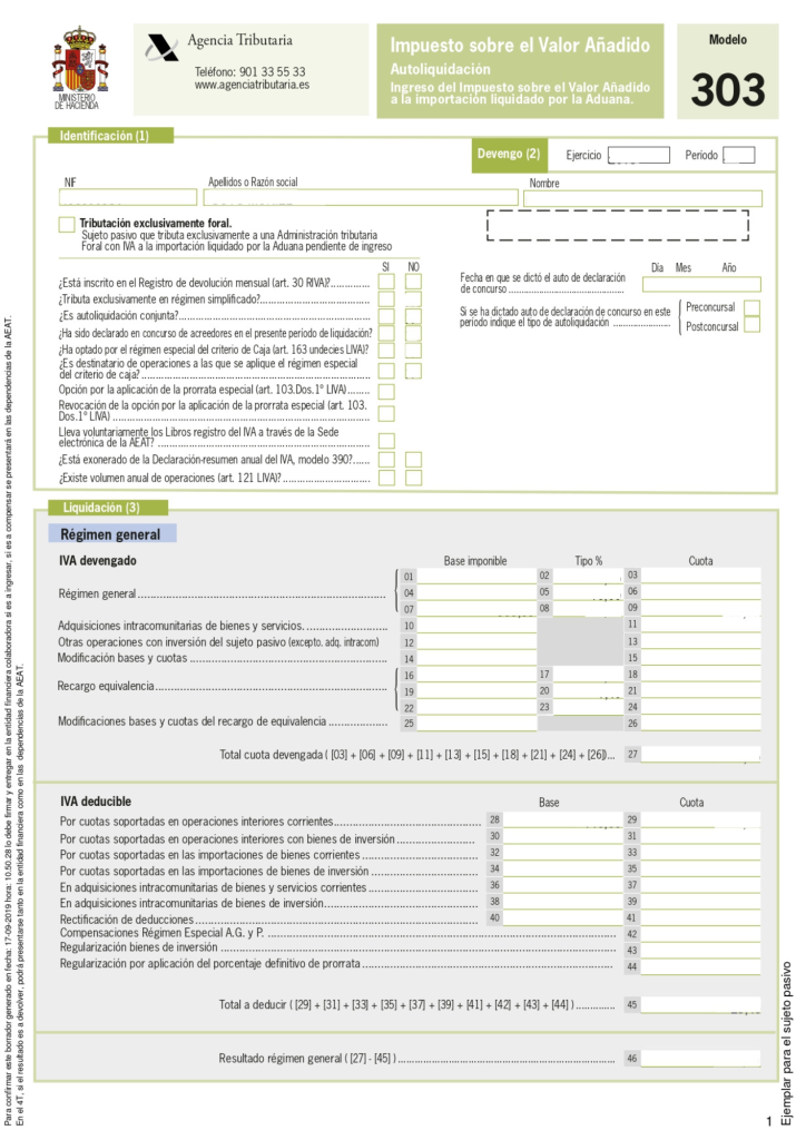 Este modelo se presenta, de forma general, trimestralmente, y su finalidad es calcular el importe de IVA, que sale a pagar o compensar. Funciona de la siguiente forma: IVA de ingresos – IVA de gastos = € a pagar (si el resultado es positivo) o compensar (si el resultado es negativo).