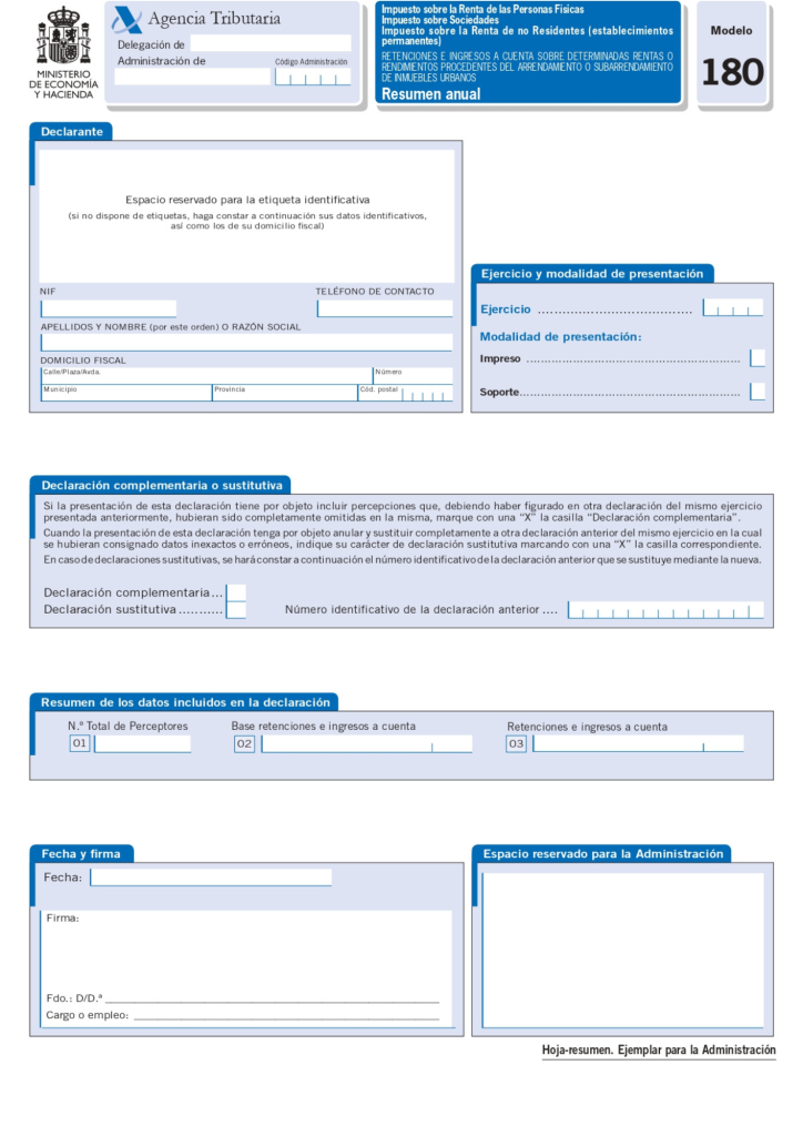 -. Modelo 180. Declaración Informativa. Retenciones e ingresos a cuenta. Rendimientos procedentes del arrendamiento de inmuebles urbanos. Resumen anual