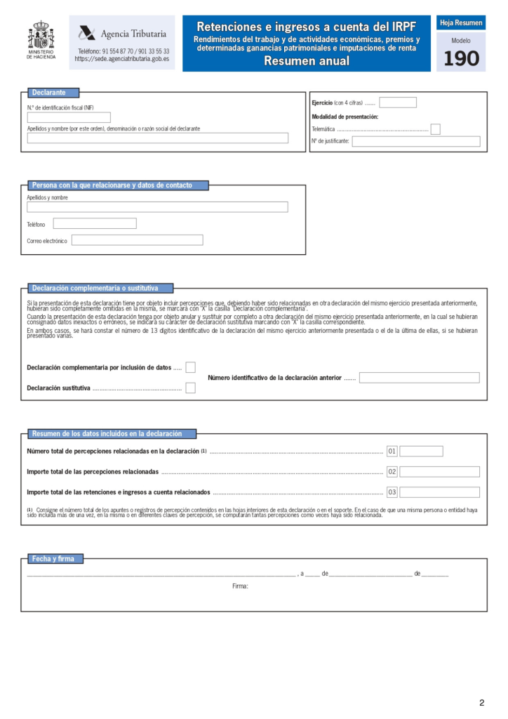 -. Modelo 190. Declaración Informativa. Retenciones e ingresos a cuenta. Rendimientos del trabajo y de actividades económicas, premios y determinadas ganancias patrimoniales e imputaciones de rentas. Resumen anual